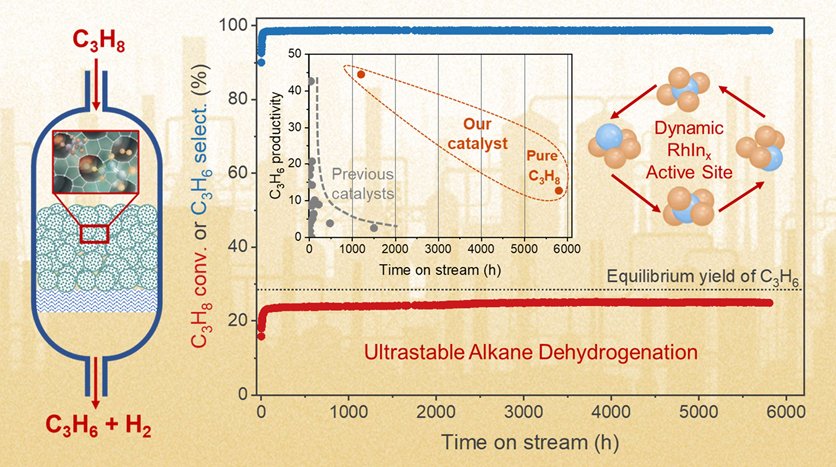 低碳烯烃是合成纤维、橡胶、塑料等诸多大宗化工产品的基础原料,全球年需求量超过3亿吨。烷烃直接脱氢是工业制烯烃的重要途径,目前商业技术主要掌握在欧美企业,包括UOP公司的Oleflex工艺、Lummus公司的Catofin工艺等。由于反应须在苛刻的高温条件下进行,商业化烷烃脱氢催化剂(Pt基和Cr基催化剂)仍面临易烧结、易积碳、催化剂需频繁再生以及由此带来的高能耗、高排放等一系列问题。因此,创制具有自主知识产权的超高稳定性催化剂,开发新一代烷烃直接脱氢技术并推进其产业化是重中之重。