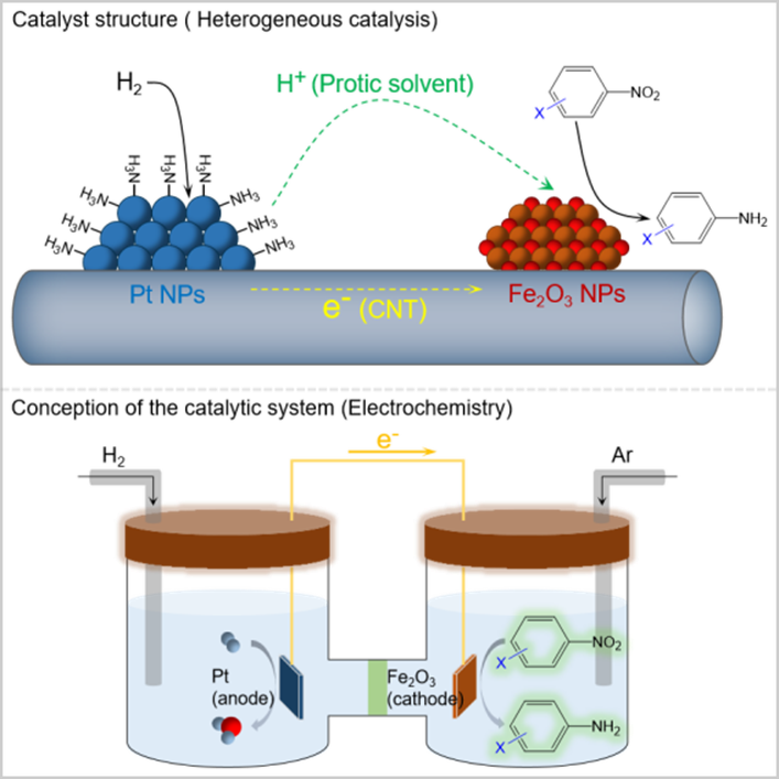 催化剂设计的关键在于深入认识和精准构筑催化活性中心。催化反应常常涉及多种分子的表界面活化转化过程,仅用单一活性位点来控制所有相关物种往往难以达到最佳性能,导致催化剂性能通常表现出火山型变化规律,催化活性、选择性无法同时提升等。为破解芳硝基化合物加氢反应中活性和选择性难以兼顾这一难题,郑南峰教授和秦瑞轩副教授团队在前期研究工作的基础之上(Angew. Chem. Int. Ed. 2024, e202408731; CCS Chem. 2023, 5, 1215-1224; Sci. Chi. Chem. 2022, 65: 726-732; Angew. Chem. Int. Ed. 2020, 59: 12736-12740; Nat. Mater. 2016, 15: 564-569),设计了一种具有纳米电偶结构的新型催化剂,在芳硝基化学物加氢反应中同时大幅提高了硝基的加氢活性和选择性。该催化剂由共载于碳纳米管(CNT)且空间分离的Pt和Fe2O3纳米粒子所构成。通过一系列实验证明,反应中H2在表面配体修饰的Pt纳米粒子表面解离为质子和电子,并分别通过CNT和质子型溶剂传递至Fe2O3纳米粒子,实现高活性与高选择性兼顾的硝基还原反应。这种催化机制类似于在纳米尺度上构筑原电池反应,不仅可利用少量Pt提升大量Fe2O3位点上的芳硝基还原活性,节约了贵金属Pt的使用;同时独特的反应路径可以避免其他不饱和基团的加氢转化,提升了反应选择性。在此基础上,进一步设计出抗硫毒化的加氢催化剂,可用于芬苯达唑等药物中间体生产。该工作利用电化学原理来构筑多相加氢催化剂,为催化剂设计开辟了新的思路。