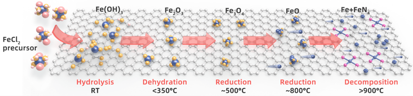 随着全球对清洁能源技术的追求,质子交换膜燃料电池(PEMFCs)因其高能量密度和环境友好性而备受关注。然而,传统的铂基催化剂因高昂的成本和资源稀缺性限制了其商业化应用。Fe/N/C催化剂作为一种非铂催化剂,因其出色的氧还原反应(ORR)性能而成为研究热点。然而,对于催化剂的合成过程,特别是在热解条件下前驱体向Fe和N掺杂的碳催化剂的结构转变,目前了解甚少。