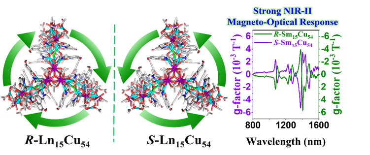孔祥建教授与龙腊生教授课题组基于前期在手性稀土-过渡金属团簇磁光效应的研究基础(J. Am. Chem. Soc. 2024, 146, 16389;J. Am. Chem. Soc. 2023, 145, 22176;J. Am. Chem. Soc. 2022, 144, 8837),设计合成了三对R/S-Ln15Cu54(Ln = Sm,Gd,和Dy)手性稀土-过渡金属团簇。结构分析表明,R/S-Ln15Cu54是目前报道的最大稀土-铜团簇,具有C3对称性的笼状分子结构。磁圆二色(Magnetic Circular Dichroism,MCD)光谱在NIR-II区表现出基于f–f跃迁的强磁光响应。其中,R/S-Sm15Cu54的MCD效应的g-factor在1300-1450 nm达到5.5×10-3 T-1。这种强NIR-II磁光活性归因于强磁偶极允许的f–f跃迁和结构的螺旋手性。这项工作不仅展示了迄今最大的Ln-Cu团簇,而且证明了磁偶极允许的跃迁对磁光活性的关键作用。