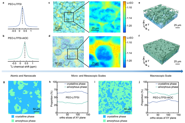 聚环氧乙烷(PEO)是用于全固态电池的重要聚合物电解质之一,然而其室温离子电导率极低(10−6 S cm-1),难以满足全固态电池的现实需求。针对这一问题,陈嘉嘉教授课题组与福建物构所方伟慧研究员合作,利用X射线断层扫描、拉曼光谱和固体核磁共振技术,从原子、纳米团簇水平到微米水平对聚合物网络中锂离子传输进行全面理解,并利用铝氧团簇(AlOC)制备基于PEO的超离子导体。AlOC与PEO链段、LiTFSI间的超分子相互作用可以有效调节晶区和非晶区的三维形貌,直接影响锂离子在体相的分布,从而重建和增强离子输运网络。因此,PEO-LiTFSI-AlOC可以在室温范围内表现出类似熔融态锂离子导电行为,在35°Ϲ时离子电导率为1.87 × 10−4 S cm−1。研究团队进一步采用PEO-LiTFSI-AlOC构建了具有高倍率性能和稳定循环性能的锂对称电池和Li|LiFePO4全电池,以及优异的LiFePO4正极(16.8 mg cm−2)高负载条件下的电池性能。