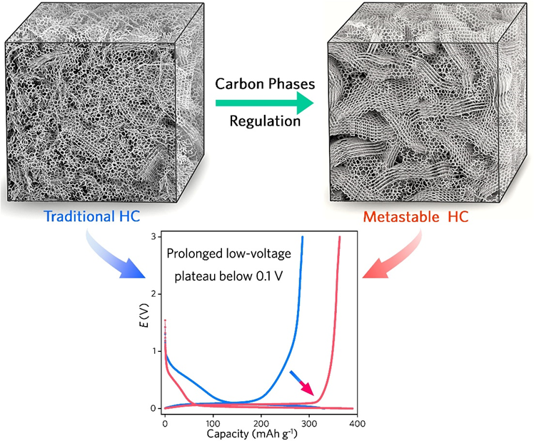 在电池体系中,电极材料通常具有固定的氧化还原电位,尽管受工作环境的影响(如极化)会发生一定变化,但难以实现大范围的改变。碳材料是电极材料中非常特殊的一类,不同微观结构和元素掺杂的碳材料会表现出差异极大的电化学行为和工作电位平台,但这并不代表我们可以对某一特定碳材料的电化学平台进行大幅度地调制。对于一些重要的电池材料,如钠离子电池中的硬碳负极,其工作电压平台存在明显的倾斜区(图中蓝线),会严重影响全电池的输出电压和能量密度,这就要求我们发展出可大范围精准调制碳材料工作电压平台的创新方法,实现对电化学反应行为的可定制化。