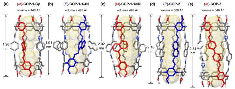 苏纪豪教授课题组基于网格化学原理,发展了一种通用的合成方法,成功制备了一系列同构的共价有机管柱(iCOPs),设计了不对称芳烃大环基元,并通过与多种刚性二胺连接体进行动态共价亚胺缩合反应,精确构建了多种iCOPs纳米管。这些纳米管不仅保持了结构一致性,在腔体形状方面还表现出显著的可调性。该系列iCOPs内部具有连续的一维通道结构,通过调节管柱长度,实现了对不同链长的α,ω-二溴烷分子的特异性主客体相互作用。这一创新研究展示了网格化学在复杂分子混合物识别与分离技术中的巨大潜力。