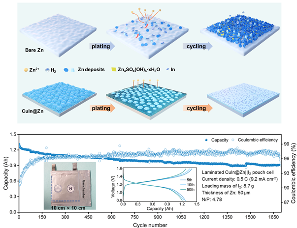 近日,我院赵金保教授/杨阳副教授团队在锌金属电池负极界面设计的研究中取得新进展,相关成果以“Synergetic Bifunctional Cu-In Alloy Interface Enables Ah-Level Zn Metal Pouch Cells”为题发表在Nature communications期刊(DOI: 10.1038/s41467-024-53831-z)。