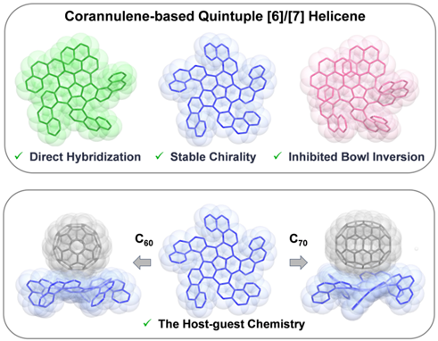 近年来,纳米石墨烯(作为电子供体)与富勒烯(作为电子受体)的超分子自组装研究取得了显著进展。这不仅有助于对富勒烯结构的精准表征,还推动了具有独特光学、电子及生物功能的组装材料的开发。多重螺烯是弯曲纳米石墨烯的典型代表,然而其与富勒烯之间主客体超分子组装的相关研究却鲜有报道,这可能是由于两者的形状不匹配所导致。