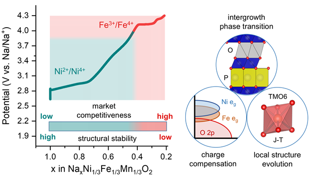 钠离子电池因其丰富的钠资源和低成本而闻名。特别是采用NFM正极的钠离子电池的能量密度是目前可用的钠离子电池中最高的,且拥有相对较低的成本。然而,根据宁德时代(CATL)的资料,在目前常规的DOC下,基于NFM正极的钠离子电池在成本上并不比其主要竞争对手磷酸铁锂电池更有优势。提高DOC是提升电池能量密度、降低单位成本的有效方法。然而,相比于锂离子电池镍钴锰基正极材料(NCM)成熟的研究,对钠离子电池镍铁锰基材料(NFM)的研究仍有很多模糊不清的地方。关于NFM在脱钠过程中的相变、电荷补偿机制以及局部共价环境的变化等方面的研究还不够充分。因此,需要要对高脱钠态下NFM的结构演变有更清晰的认识,从而改进其在高DOC下的循环性能。