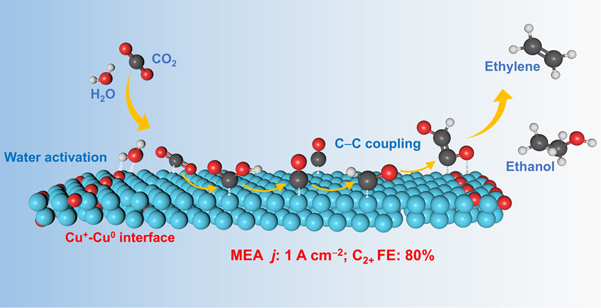 水在CO2电催化还原中扮演着关键角色。在膜电极电解池中,因不使用阴极电解液,水的调控尤为重要。团队设计了具有丰富Cu2O与金属Cu界面(Cu2O-Cu0)的纳米复合催化剂,发现通过阴极共进水可显著提升该催化剂的CO2制乙烯、乙醇性能。在优化的水分压、3.8 V池压和1 A cm-2电流密度条件下, C2+产物(主要为乙烯、乙醇)的法拉第效率和选择性可分别达到80%和83%,C2+产物单程收率达19%。此外,该催化剂的C2+产物能量转化效率高达31%,且在350小时测试过程中表现出良好的稳定性,综合性能优于目前该领域已报道的结果。结合安培级电流密度下膜电极模式的工况XRD、XAS、拉曼光谱表征和同位素示踪等研究,证实了反应过程中Cu+可稳定存在;进一步结合原位拉曼光谱等表征及理论计算,揭示Cu+促进水活化,进而通过促进吸附态CO和CHO的形成来增强它们之间的C-C偶联,促进关键反应中间体OCCHO*的生成。本工作首次提出并证实了Cu+促进水活化和C-C偶联生成C2+化合物的催化作用机制,并发展了一种通过结合水调控和电催化剂设计以提高膜电极电解池中CO2还原制C2+化合物的新策略。