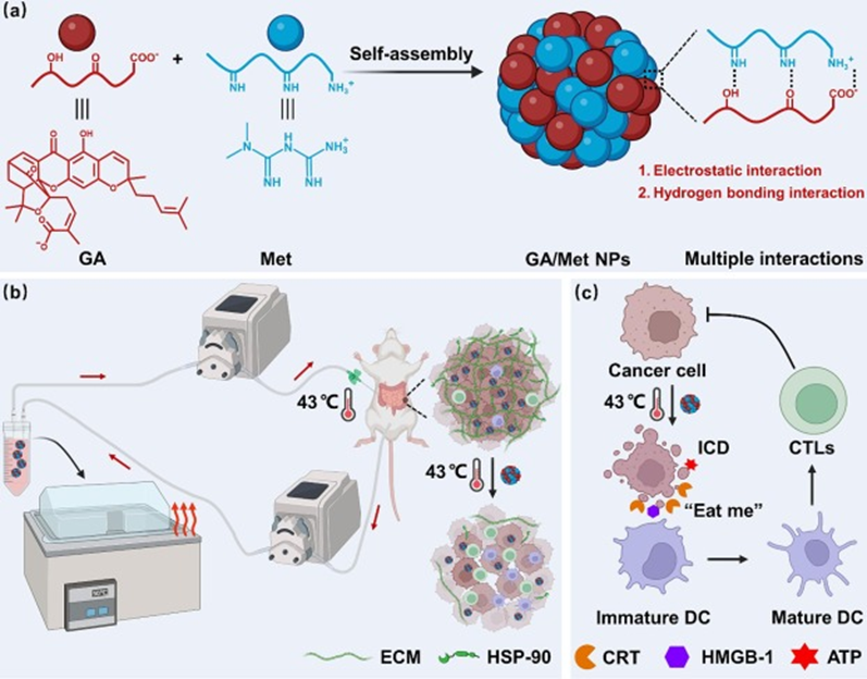 田华雨教授课题组方华攀副教授与苏州大学陈倩教授等人通过超分子组装,将临床使用药物藤黄酸(GA)和二甲双胍(Met)组装形成纳米组装体(GA/Met NPs),以用于促进HIPEC治疗腹腔盆腔癌症,如结直肠癌和卵巢癌。使用GA/Met NPs的HIPEC具有以下几个独特优势:(1)轻度加热(MH)诱导癌细胞免疫原性细胞死亡(ICD),导致损伤相关分子模式(DMAPs)的释放,包括高迁移率族蛋白B1(HMGB-1)、三磷酸腺苷(ATP)和钙网蛋白(CRT),从而增强肿瘤微环境的免疫原性。(2)GA不仅作为一种化疗药物诱导癌细胞死亡,还作为热休克蛋白(如HSP-90)的抑制剂,增强癌细胞对热疗诱导的凋亡的敏感性。(3)二甲双胍同时消除肿瘤细胞外基质成分,如转化生长因子β1(TGF-β1),从而增强纳米药物在肿瘤组织中的穿透力,并促进肿瘤组织中细胞毒性T淋巴细胞的招募和活性。(4)使用GA/Met NPs的HIPEC在体内引发了显著的抗肿瘤免疫反应,有效抑制了结直肠癌和卵巢癌的原位生长,大幅延长了肿瘤小鼠的生存时间。这种由临床使用药物组装成的GA/Met NPs作为有前途的治疗剂,在HIPEC治疗腹腔盆腔肿瘤中展现出了一定潜力。