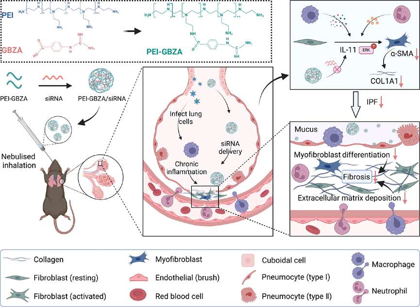 许多临床研究表明,IPF与白细胞介素11(IL-11)之间有着显著的相关性。以IL-11为靶点的治疗策略为IPF的治疗提供了希望。基于前期的研究基础,方华攀副教授、杨洋教授等人创新性地开发了一种可吸入小干扰RNA(siRNA)载体PEI-GBZA。PEI-GBZA能够通过静电和氢键等多重作用有效地封装siRNA。通过吸入法,这种siRNA递送系统可以有效地将PEI-GBZA/siIL-11纳米颗粒保留在肺组织中,并且在博来霉素诱导的肺纤维化模型中,对多个关键病理过程(如成纤维细胞的迁移与分化、细胞外基质的沉积、炎性因子的释放,以及免疫细胞(中性粒细胞和巨噬细胞)的募集与激活)表现出显著的抑制作用。这种靶向干预策略不仅有效阻止了疾病的进展,还显示出良好的体内安全性。该治疗策略将为多种呼吸系统疾病的治疗提供有益的参考。