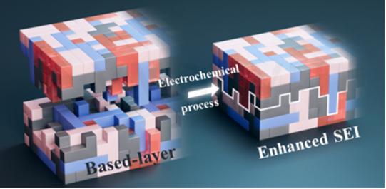 本研究提出了一种新的研究思路,通过化学作用在锂金属负极表面预构建具有开放式榫卯结构和强结合力的基础层,用于连接后续电化学反应形成的固态电解质界面层(SEI),形成增强的表面膜。具体而言,首先通过2-(氟磺酰基)二氟乙酸(DFSA)与锂金属的化学反应,生成与金属锂紧密结合的基础层。随后,引入具有与DFSA类似分子结构的三甲基硅基2-(氟磺酰基)二氟乙酸(TSFSA)作为SEI增强剂。凭借低的LOMO能级,SEI增强剂在电化学反应过程中优先分解,生成与基础层一致的SEI组分,从而强化基础层并形成了增强SEI(ESEI)。具有ESEI的锂金属负极在碳酸酯电解液中实现了高度可逆的锂沉积/剥离过程。此外,与高负载正极组装的全电池在低N/P比条件下也展现出优异的循环稳定性,显示出在高能量密度锂金属电池实际应用中的巨大潜力。