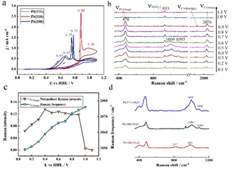 在该工作中,李剑锋教授课题组利用原位SHINERS光谱技术,获得了Pt(111)和Pt(100)上顶位和桥位吸附的CO*分子的拉曼信号,而在Pt(110)表面仅观察到顶位吸附的CO*分子。另一方面,在Pt(111)和Pt(100)表面CO电氧化过程中的氧化前峰区间,原位观测到了OH*和COOH*物种形成和消失的直接光谱证据,并通过同位素取代实验和密度泛函理论进行了验证,说明OH*和COOH*物种的形成和吸附在CO分子的电氧化过程中起着至关重要的作用,并与CO电氧化过程中氧化前峰相关。