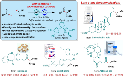 霍浩华教授课题组经过一系列的努力,使用组合催化策略,将可见光催化和过渡金属镍的不对称催化结合起来,发展了一种高效的替代现行的氨基化反应方案:α-氨基C(sp3)-H的直接对映选择性酰基化反应。该方法使用商品化、来源广泛的有机羧酸作为酰基化试剂,简单易得的苯甲酰基胺作为氨基化试剂,在商品化的手性镍催化剂和铱光催化剂的作用下,在温和的反应条件下直接发生偶联反应,以高产率、高对映选择性得到手性α-氨基酮类化合物,并且具有非常广谱的底物适用范围和官能团兼容性。特别值得指出的是,此方法适用于药物的后期修饰,已经成功应用于青蒿琥酯(治疗疟疾药物)、苯扎贝特(降血脂药)等药物的后期酰基化反应,高效地引入了手性氨基酮药效官能团。